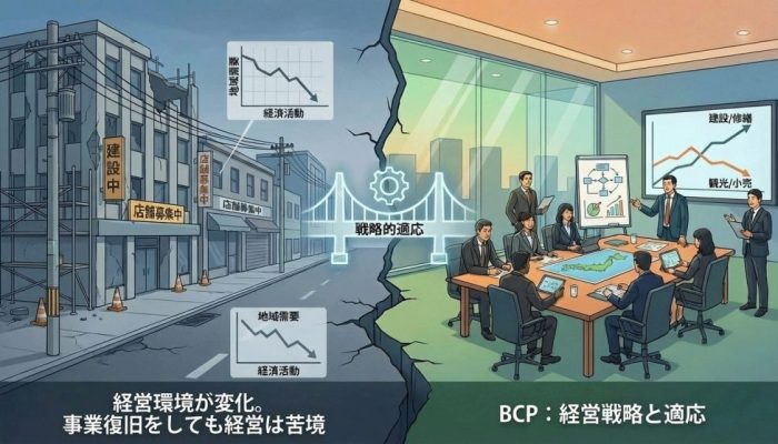 コロナ禍、能登半島地震の両方に共通しているのは、感染や被災そのものよりもそれに伴う経営環境の変化が企業の存続を左右したという点である。BCPとはただ復旧することではなく、そのような経営環境の変化に対応する戦略をあらかじめ考える必要がある。いわゆるBCP戦略が重要になってくる。しかし、企業のBCPでは、このBCP戦略がおろそかになりがちである。